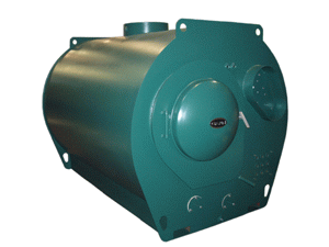 These are not small units: the three models available range from 1500 to 3200 US gallons of water storage and weigh in at two tons or more when empty. They are usually placed in a separate building from the house, mostly because of size. Although in the same general category as the more common self-contained outdoor wood heaters, Garn heaters require protection from the elements, usually in a dedicated building which houses the heater, circulating pump and controls. This can be combined with firewood storage or other storage, or even a shop, as long as it does not house motor vehicles or gasoline (for safety). The hot water produced by the Garn is pumped to the house (and/or shop, greenhouse, barn, etc.) to be distributed there.